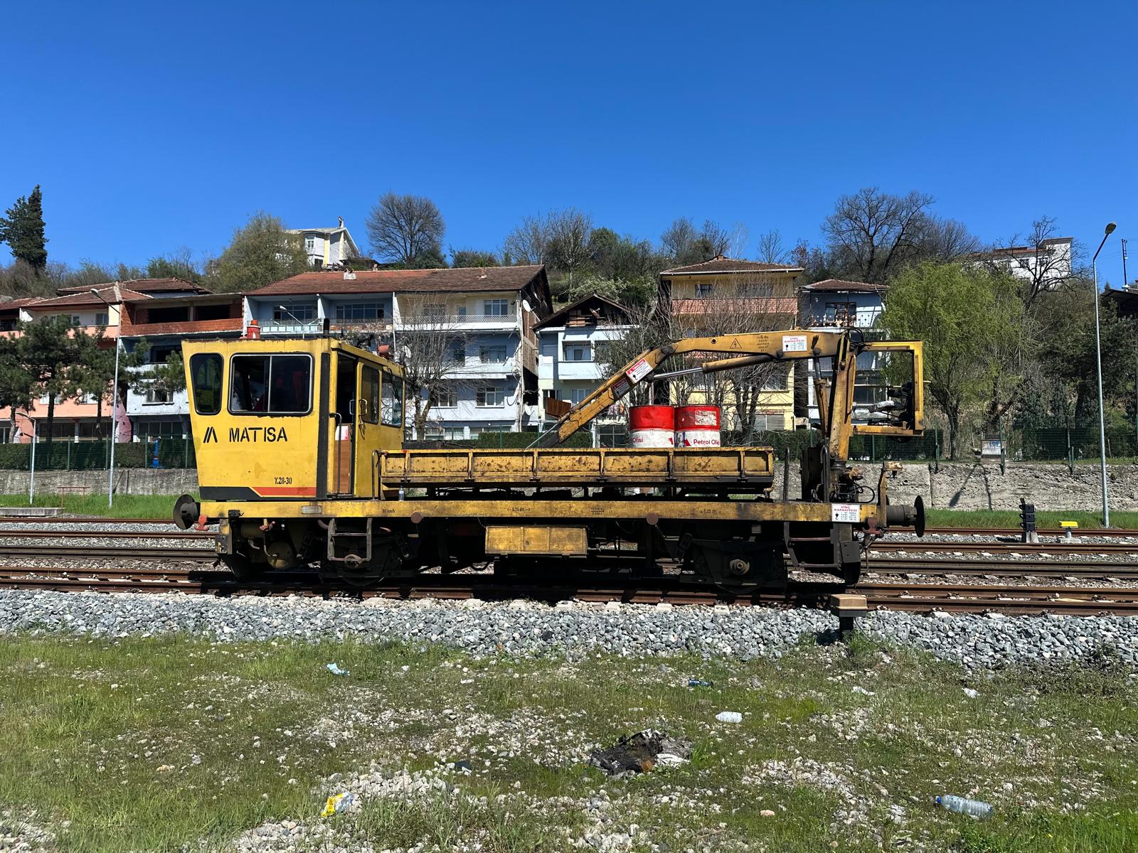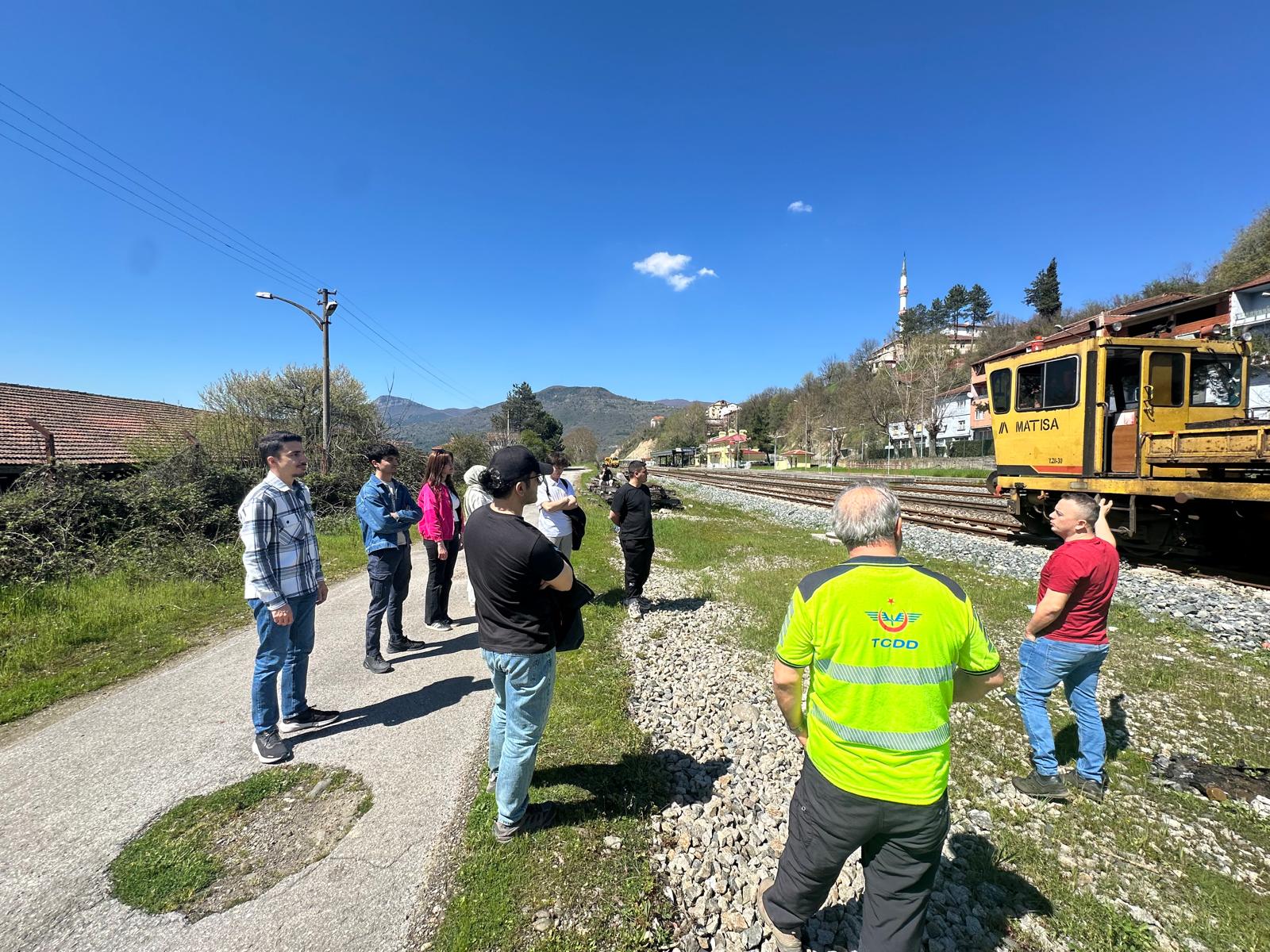 Raylı sistem makine teknolojisi ögrencileri Yenice istasyonunda demiryolu yol onarımlarında kullanılan vinci inceledi.